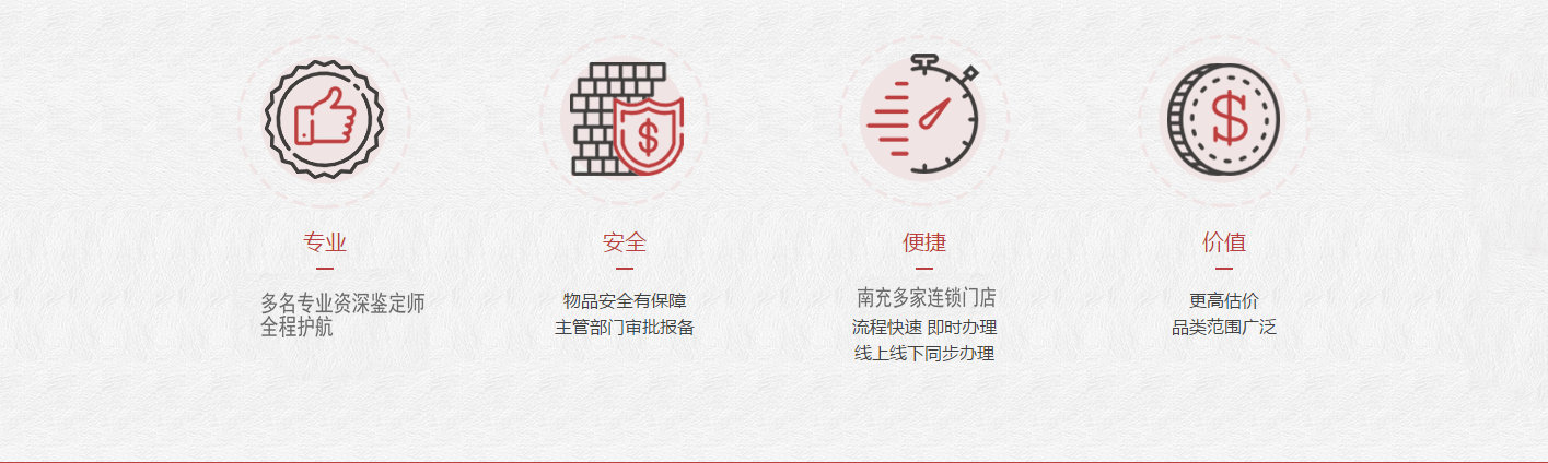 ——南充市團(tuán)結(jié)店(地址:順慶區(qū)和平東路1號(hào),團(tuán)結(jié)商務(wù)大酒店對(duì)面,電話(huà):181-2180-3333)。此店為公司總部,一是對(duì)房產(chǎn)放款。凡是全款房、按揭房、二抵房均可以放款,快當(dāng)天放款;二是汽車(chē)質(zhì)押。全款車(chē)、按揭車(chē)評(píng)估后10分鐘內(nèi)放款;三是對(duì)黃金、K金、名表、名包、鉑金、鈀金、鉆戒、翡翠、手機(jī)、相機(jī)、老酒、手機(jī)靚號(hào)并當(dāng)場(chǎng)放款;四是開(kāi)展微信會(huì)員活動(dòng)(凡是加入公司微信即成為會(huì)員),對(duì)會(huì)員的物件免費(fèi)鑒定、免費(fèi)評(píng)估、免費(fèi)清洗。